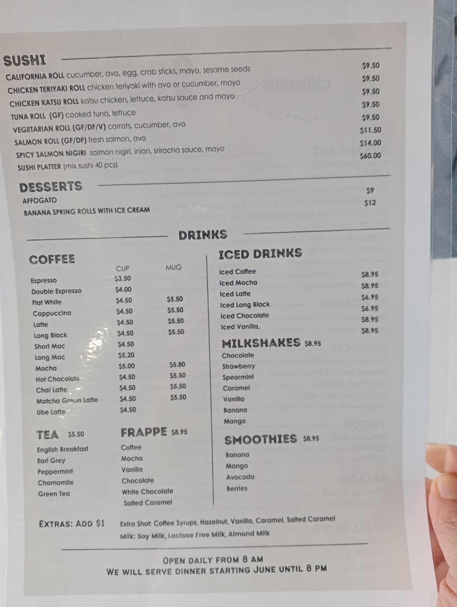 Start your day with their freshly made sushi rolls, like the Veggie Roll or the Chicken Teriyaki Roll, priced at just A$9.50. For lunch or dinner, the Steak & Cheese Sandwich (A$19.95) and the Southern Fried Chicken Club Sandwich (A$19.95), both served on sourdough toast, are crowd-pleasers.